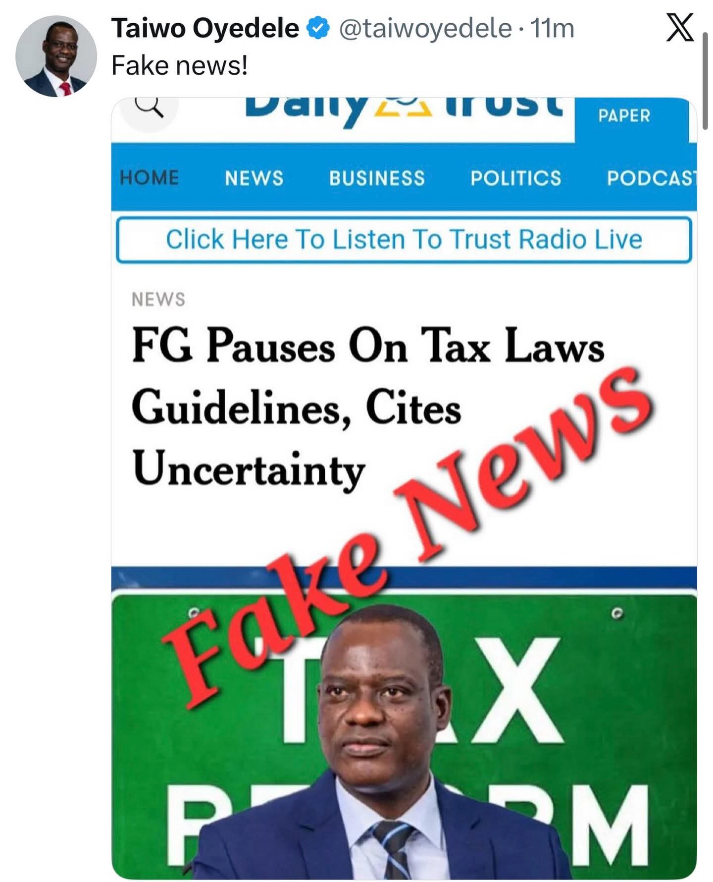 Oyedele debunked the claim via a post on his verified X (formerly Twitter) handle, where he shared a screenshot of the circulating media report and boldly labelled it “Fake News.”