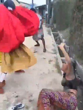 In the video, the woman is seen lying on the ground beside an open drainage channel, screaming as a masquerade dressed in a red-and-yellow costume repeatedly strikes her with a cane-like object. She is barefoot, visibly distressed, and attempts to shield herself while crawling away from the attack.